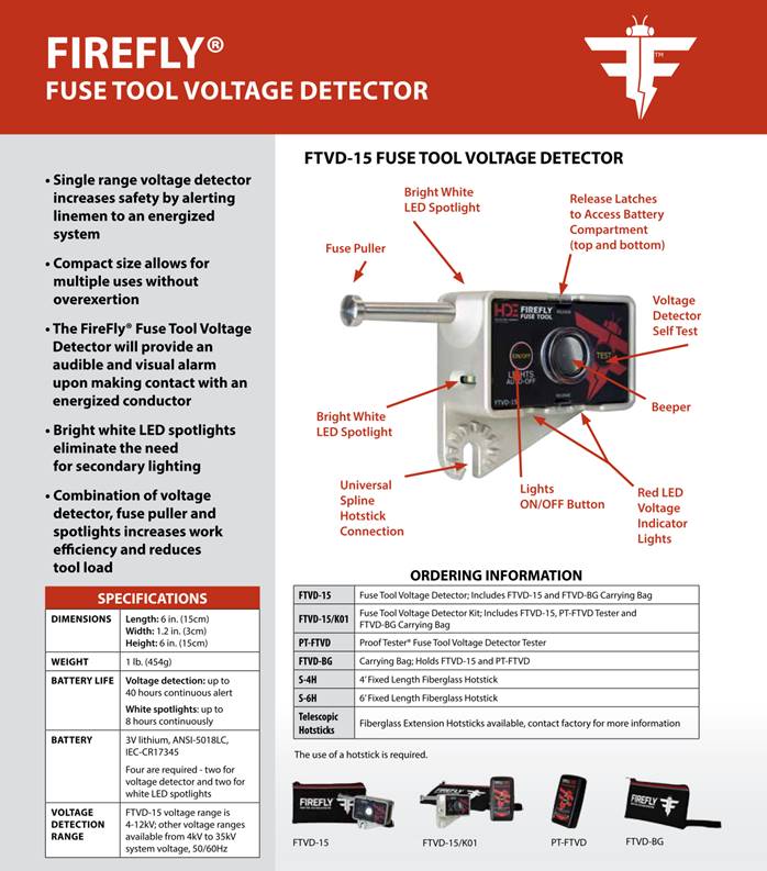The FireFly® Fuse Tool Voltage Detector, model FTVD-15, combines a fuse tool, voltage detector and spotlight in one single product, saving time and adding an extra level of safety while working on distribution lines. The voltage detection function will check for voltage on the line - red LEDs will flash and an audible alarm is activated when voltage is detected. Then use the Fuse Tool function to open and close the fuse cutout or switch. Bright white lights located on both the top and front of the tool will provide illumination at night or in the dark for better visibility and added safety. Get the work done three times as fast with the FireFly™ Fuse Tool Voltage Detector!