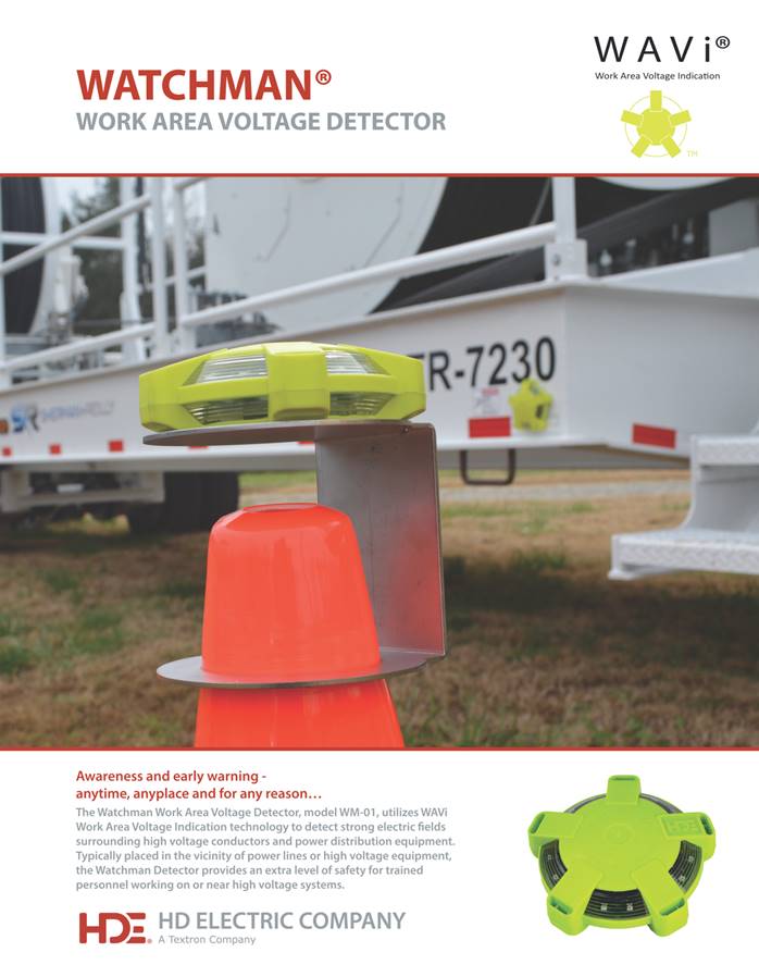 The Watchman® Work Area Voltage Detector, model WM-01, utilizes WAVi Work Area Voltage Indication technology to detect strong electric fields surrounding high voltage conductors and power distribution equipment. Typically placed in the vicinity of power lines or high voltage equipment, the Watchman Detector provides an extra level of safety for trained personnel working on or near high voltage systems.