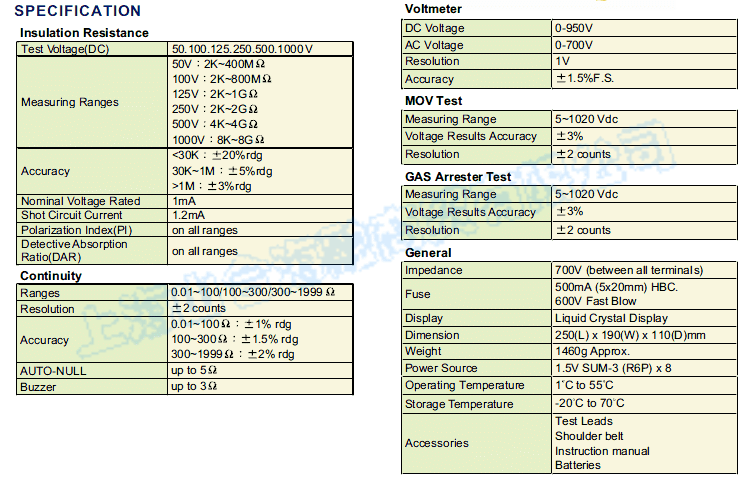 Large range of insulation test voltages : 50, 100, 125, 250, 500, 1000V. |