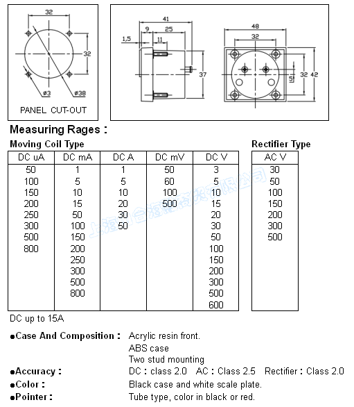 | ● 準確度 : 動圈軸心式 : 2.0 級 / 鐵片型 : 2.5 級 / 動圈式整流型 : 2.0 級 |