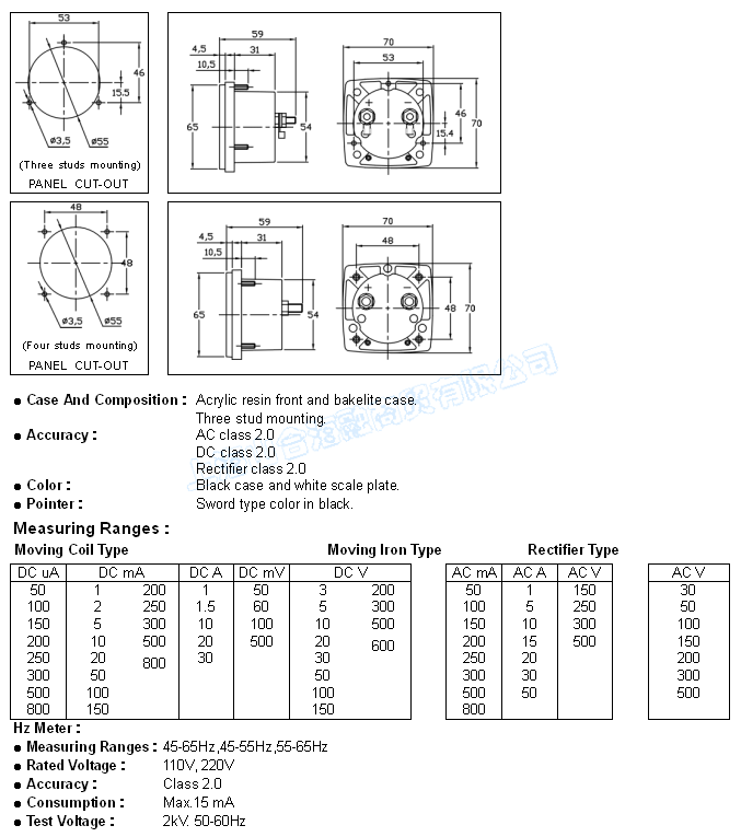●準確度 : 動圈軸心式 : 2.5 級 / 鐵片型 : 2.0 級 / 動圈式整流型 : 2.0 級