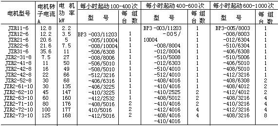 根据电机规格、操作频繁程度的不同可在下表中直接查出频繁变阻器的规格及每组台数,其系列表见表1和表2