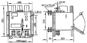 3.2 DW15-1000、1600、2500、4000万能式断路器 该断路器为立体布置形式,触头系统、操作机构均安装在铁制框架上。上部装有灭弧系统,右面装有操作机构。有“通”,“断”指示及手动“合”,“分”按钮。左侧面装有分励脱扣器、欠电压脱扣器。速饱和电流互感器或电流电压变换器套在下母线上。欠电压延时装置、热继电器或半导体脱扣器均可分别装在下方。