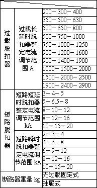4 断路器过电流脱扣器的整定电流调节范围及断路器的重量见表4