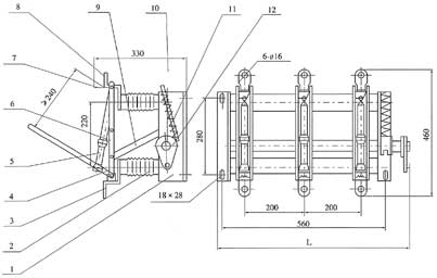 1、底架 2、支柱绝缘子 3、支座接线板 4、触刀 5、灭弧室 6、扭簧及扭簧销轴 7、导向片 8、触座接线板 9、拉杆 10、转轴 11、弹簧储能机构 12、操作盘