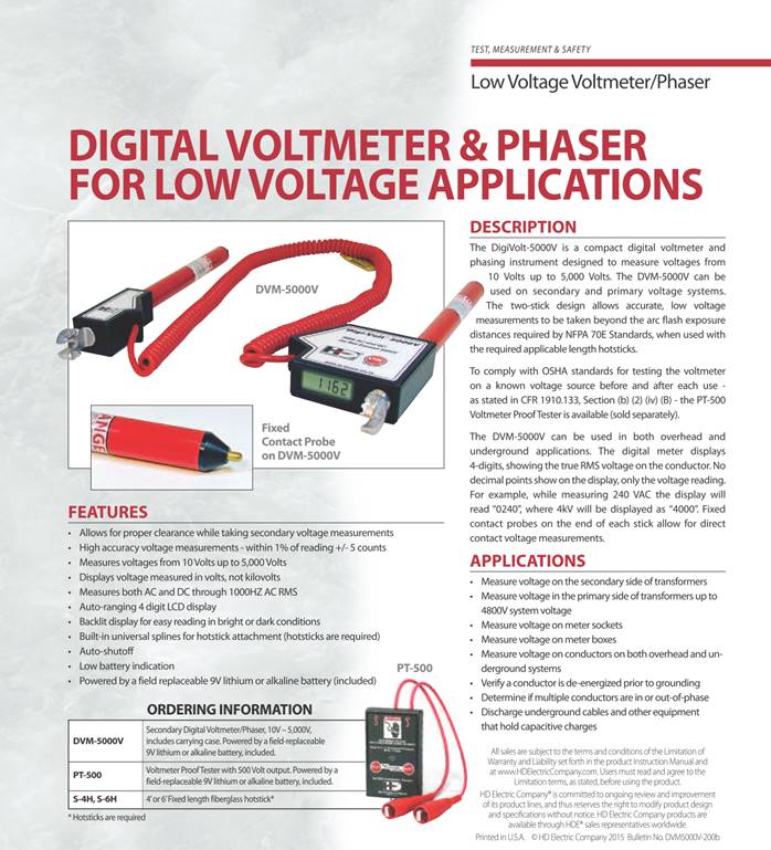 The DVM-5000V is a digital voltmeter/phasing set for low voltage applications from 10V up to 5,000V.  The DVM-5000V can be used in both overhead and underground applications when used with the required applicable length hotsticks.  The digital meter displays 4-digits, showing the true RMS voltage on the conductor.  No decimal points show on the display, only the voltage reading.  Fixed contact probes on the end of each stick allow for direct contact voltage measurements.