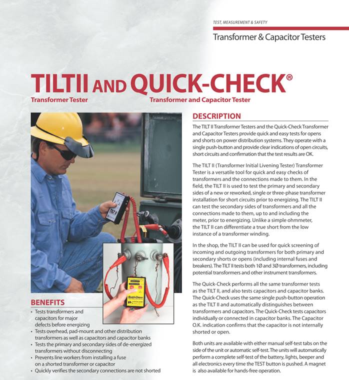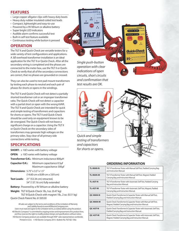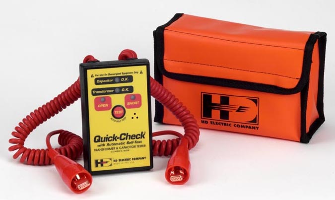 Transformer & Capacitor Tester The Quick-Check® Transformer and Capacitor Tester is a versatile tool for quick and easy checks of capacitors, transformers and the connections made to them. In the field, the Quick-Check is used to test the primary and secondary sides of new or reworked, single or three-phase transformer installations for short circuits prior to energizing. In the shop, the Quick-Check is used for the quick screening of incoming and outgoing transformers for both primary and secondary shorts or opens, including internal fuses and breakers. The Quick-Check also tests capacitors and capacitor banks. A magnet is available to hold the Quick-Check in place while testing. Transformer and Capacitor Tester Features · Tests transformers or capacitors for major defects before energizing · Tests the primary and secondary sides of de-energized transformers without disconnecting · Built-in self-test feature (manual or auto self-test models available) · Single button automatic testing · Audible alarm confirms successful test · Super bright LED indicators HD Electric Company is committed to ongoing review and improvement of its product lines, and thus reserves the right to modify product design and specifications without notice.