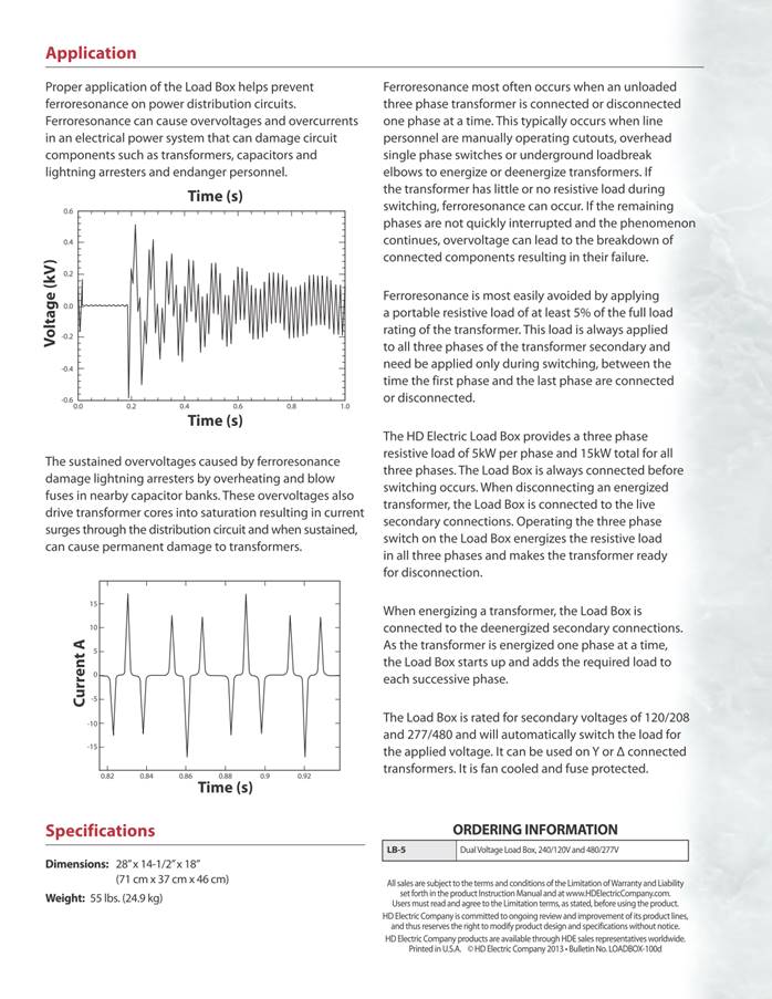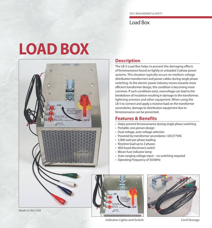 The LB-5 Load Box helps to prevent the damaging effects of ferroresonance found on lightly or unloaded 3-phase power systems.  This situation typically occurs on medium voltage distribution transformers and power cables during single phase switching.  As the electric power industry moves towards more efficient transformer design, this condition is becoming more common.  If such conditions exist, overvoltage can lead to the breakdown of insulation resulting in damage to the transformer, lightning arresters and other equipment.  When using the LB-5 to connect and apply a resistive load on the transformer secondaries, damage to distribution equipment due to ferroresonance can be prevented.