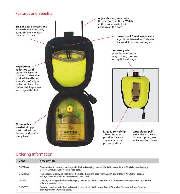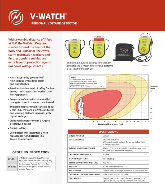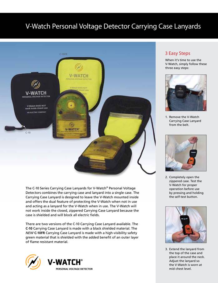 V-Watch Personal Voltage Detectors Worn on the outside of your clothing at mid-torso, the V-Watch® Personal Voltage Detector provides that extra level of safety by detecting and alerting you to the presence of electrical fields or energized electrical equipment. In emergencies, you and your crews can move in safely to quickly restore power to your customers. The V-Watch is available in both a standard model and a pro model with a mute feature. Each comes in a tough nylon carrying case lanyard that is worn around the neck during use. The C-10 Series Carrying Case Lanyards for V-Watch® Personal Voltage Detectors combines the carrying case and lanyard into a single case. The Carrying Case Lanyard is designed to leave the V-Watch mounted inside and offers the dual feature of protecting the V-Watch when not in use and acting as a lanyard for the V-Watch when in use. The V-Watch will not work inside the closed, zippered Carrying Case Lanyard because the case is shielded and will block all electric fields. There are two versions of the C-10 Carrying Case Lanyard available. The C-10 Carrying Case Lanyard is made with a black shielded material. The NEW C-10FR Carrying Case Lanyard is made with a high-visibility safety green material that is shielded with the added benefit of an outer layer of flame resistant material. V-Watch Personal Voltage Detector Instructional Video Personal Voltage Detector Features · Alerts user to proximity of high voltage · Audible and visual alarms increase in frequency the closer the user gets to energized equipment · Typical V-Watch warning distance is about 7 feet (2.13m) from a 4kVAC conductor · Provides another level of safety for storm restoration workers and first responders · Low battery indicator · Field replaceable 9V battery · Rugged protective housing · Built-in self test · Lightweight · Carrying case lanyard · Two versions available - can be used with any V-Watch models, old or new · C-10FR carrying case lanyard - high-visibility safety green shielded material with an outer layer of flame resistant material · C-10 carrying case lanyard - black shielded material · Electrically shielded · Storage case when the V-Watch is not in use · Lanyard allows user to adjust to optimum mid-torso position HD Electric Company is committed to ongoing review and improvement of its product lines, and thus reserves the right to modify product design and specifications without notice. V-Watch 个人高压防护报警器 产品特点: