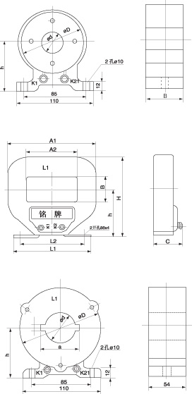 本型互感器5-800A的铁心为环形铁心,1000-3000A为矩形卷铁心。二次线圈沿心周围均匀分布,LMZ及LMZJ型塑料树脂浇注作绝缘,LMKB型为环氧树脂浇注母线式。LMK型塑料压制而成的外壳作绝缘。下部有安装板供固定安装之用,中间窗孔供一次铝母线通过之用。