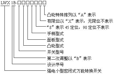 LWX1B万能转换开关(以下简称开关),适用于交流50赫兹380伏及以下直流电压至220伏,主要作电气控制线路的转换,伺服电机及微电机的转换开关之用。