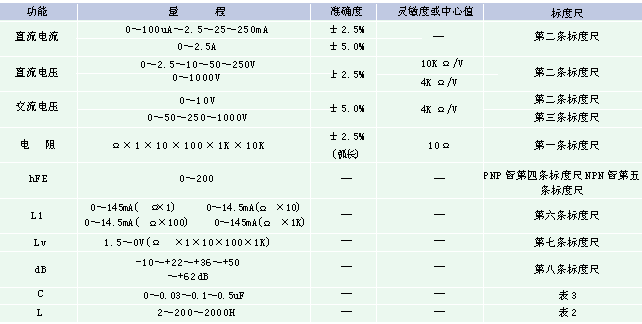 2.1 本产品采用新型横式结构,有机玻璃表盖、外形美观大方,主标度尺弧线开阔,读数清晰。 2.2 采用一个18档开关和6个插座共有19档基本量程和6个附加量程,使用方便,范围宽广。 2.3 备有小电流100 A和大电流2.5A及hFE、LI、LV的量程。有利于从事晶体管电路测量时使用。 2.4 具有表头保护装置,可防止表头因过载而损坏。