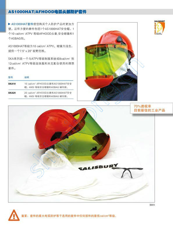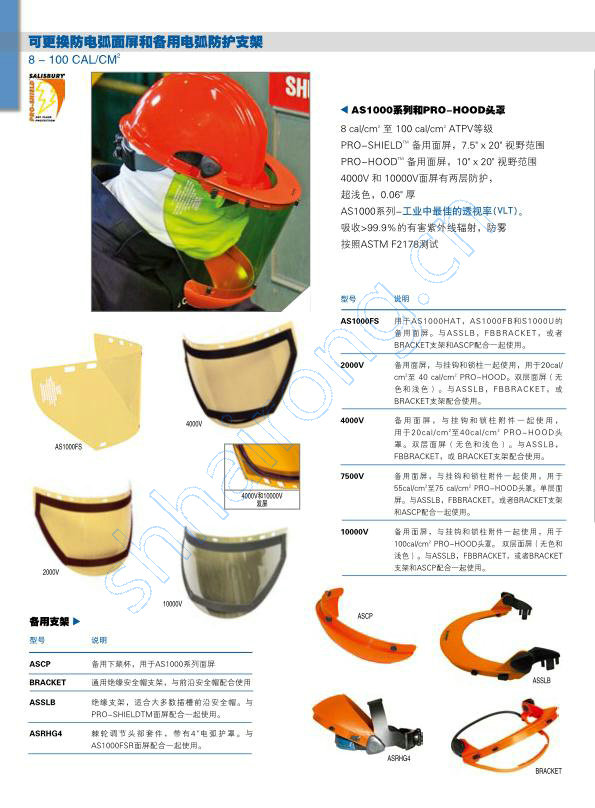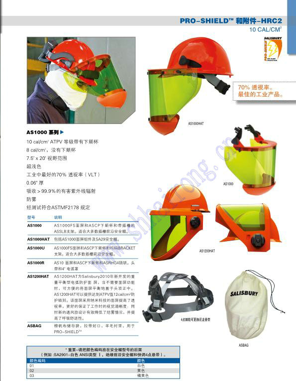 PRO-SHIELDTM和附件-HRC2 10 CAL/CM2 透视率。 的工业产品。AS1000 系列 AS1000HAT 10 cal/cm ATPV 等级带有下颏杯2 8 cal/cm,没有下颏杯2 7.5" x 20" 视野范围 C浅色 工业中良好的 透视率(VLT) 0.06" 厚 吸收>辐射 防雾 型号 说明 AS1000 AS1000FS面屏和ASCP下颏杯和带插槽的 AS1000 ASSLB支架。适合大多数插槽前沿安全帽。 AS1000U AS1000FS面屏和ASCP下颏杯和均码BRACKET 支架。适合大多数插槽前沿安全帽。 AS1000R AS10 面屏和ASCP下颏杯和ASRHG4销锁。头 带和4" 电弧罩 ASBAG 棉帆布储存袋,拉带封口,羊毛衬里,用于 PRO-SHIELDTM 4点棘轮可更换尼龙悬带 * 重要-请把颜色编码放在安全帽型号的后面 (例如 :SA2901-白色 ANSI类型 Ⅰ,绝缘前沿安全帽和快调4点悬带)。 颜色编码 颜色 ASBAG 01 白色 02 黄色 03 橘黄色 57可更换防电弧面屏和备用电弧防护支架 8 - 100 CAL/CM2 AS1000系列和PRO-HOOD头罩 8 cal/cm 至 100 cal/cm ATPV等级2 2 PRO-SHIELDTM备用面屏,7.5" x 20" 视野范围 PRO-HOODTM备用面屏,10" x 20" 视野范围 4000V 和 10000V面屏有两层防护, C浅色,0.06" 厚 AS1000系列-工业中 的透视率(VLT)。 吸收>辐射,防雾 型号 说明 AS1000FS 用于AS1000HAT,AS1000FB和S1000U的 备用面屏。与ASSLB,FBBRACKET,或者 BRACKET支架和ASCP配合一起使用。 2000V 备用面屏,与挂钩和锁柱一起使用,用于20cal/ cm至 40 cal/cm PRO-HOOD。双层面屏(无2 2 色和浅色)。与ASSLB,FBBRACKET,或 BRACKET支架配合使用。 4000V 4000V 备用面屏,与挂钩和锁柱附件一起使用, 用于20cal/cm至40cal/cm PRO-HOOD头2 2 AS1000FS 罩。双层面屏(无色和浅色)。与ASSLB, FBBRACKET,或 BRACKET支架配合使用。 7500V 备用面屏,与挂钩和锁柱附件一起使用,用于 55cal/cm至75 cal/cm PRO-HOOD头罩。单层面2 2 4000V和10000V 屏。与ASSLB,FBBRACKET,或者BRACKET支架 双屏 和ASCP配合一起使用。 10000V 备用面屏,与挂钩和锁柱附件一起使用,用于 100cal/cm PRO-HOOD头罩。 双层面屏(无色和2 浅色)。与ASSLB,FBBRACKET,或者BRACKET2000V 支架和ASCP配合一起使用。 10000V 备用支架 ASCP 型号 说明 ASCP 备用下颏杯,用于AS1000系列面屏 BRACKET 通用绝缘安全帽支架,与前沿安全帽配合使用 ASSLBASSLB 绝缘支架,适合大多数插槽前沿安全帽。与 PRO-SHIELDTM面屏配合一起使用。 ASRHG4 棘轮调节头部套件,带有4"电弧护罩。与 AS1000FSR面屏配合一起使用。 ASRHG4 BRACKET58 电弧防护产品 电弧防护头套和安全眼镜 10 - 20 CAL/CM2 Salisbury电弧防护头套(巴拉克拉法帽),与 PRO-SHIELD 配合使用时会带来360度头部和颈 部电弧变化防护。每个电弧防护头套都由两层竖织 纹路材料制成,有一个弹性面部开口来保持形状和 大小。 AFHOOD10 为10cal/cm ATPV等级并由20%2 Nomex?和80% Lenzing FR?材料制成。AFHOOD15 为15 cal/cm ATPV等级并由 Nomex?材料制2 成。AFHOOD20为20 cal/cm ATPV等级并由40%2 P84?,55%Lenzing FR?和5%Kevlar? 材料制成。 注意:电弧防护头罩必须与AS1000HAT 一同佩戴 以提供适当防护。 型号 说明 AFHOOD10 10 cal/cm防护,2 20% Nomex? / 80% Lenzing FR? 20 cal/cm 防护,2 AFHOOD20 40% P84? / 55% Lenzing FR? / 5% Kevlar? AFHOOD20 AFHOOD10 59AS1000HAT/AFHOOD电弧头部防护套件 AS1000HAT套件使您购买个人防护产品时更加方 便。这些方便的套件包括1个AS1000HAT安全帽,1 个10 cal/cm ATPV 等级AFHOOD头套,安全眼镜和12 个ASBAG包。 AS1000HAT等级为10 cal/cm ATPV。眼镜为浅色,2 提供一个7.5" x 20" 视野范围。 SKA系列是一个与ATPV等级制服系统或8cal/cm 到2 12cal/cm ATPV等级连体服和夹克配合使用的理想2 套件。 型号 说明 SKA10 10 cal/cm AFHOOD头套和AS1000HAT安全2 帽,ANSI 等级安全眼镜和ASBAG 储存袋。 SKA20 20 cal/cm AFHOOD头套和AS1000HAT安全2 帽,ANSI 等级安全眼镜和ASBAG 储存袋。 70%透视率 目前 的工业产品 SKA10 重要:套件的Z大电弧防护等于选用的套件中不同部件的Z低cal/cm等级。