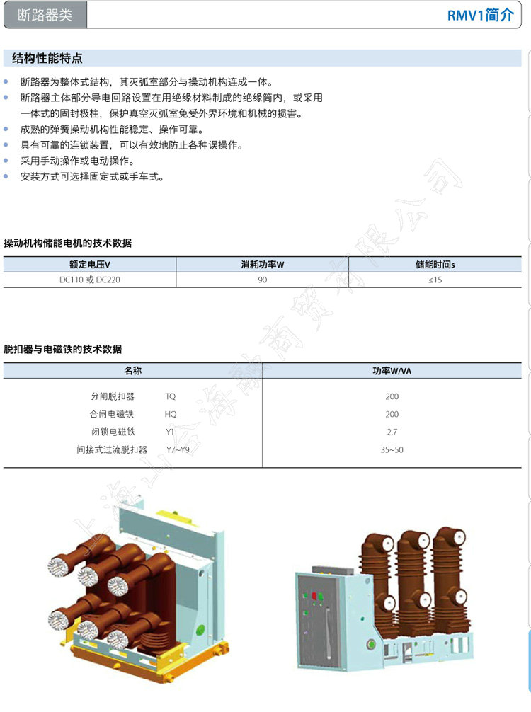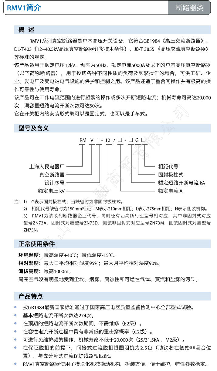上海人民电器厂RMV1系列真空断路器是户内高压开关设备。