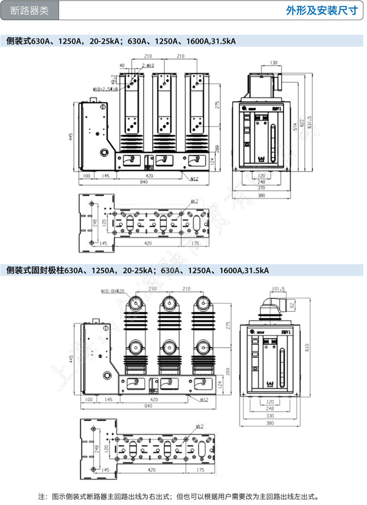 注※:当额定电流为1600A、开断电流为31.5kA时,相距为210或275可选;