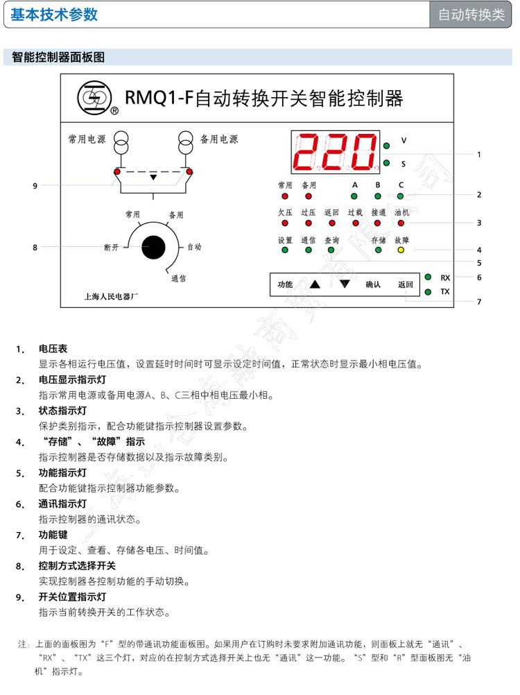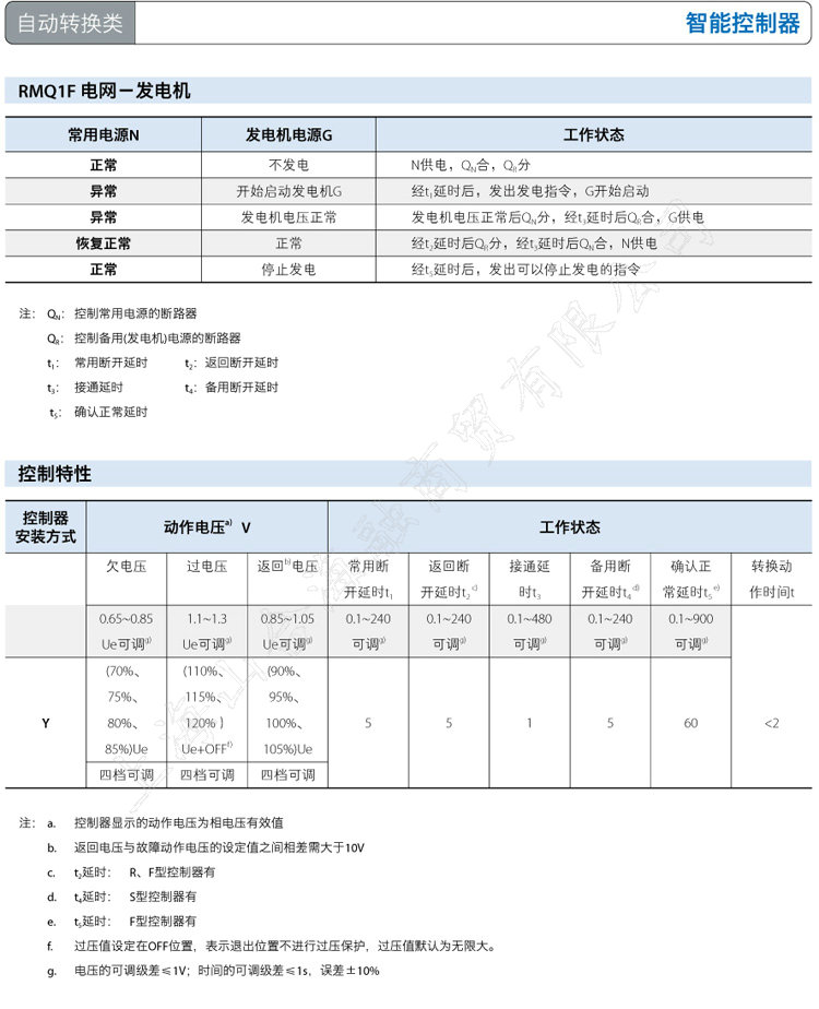 智能控制器按功能可分为自投自复(R)、自投不自复(S)、电网-发电机(F),其工作状态和控制特性见表1、2、3、4。共有